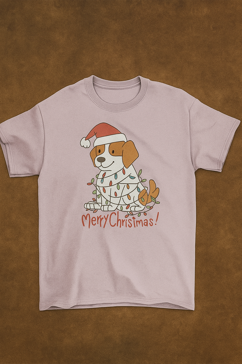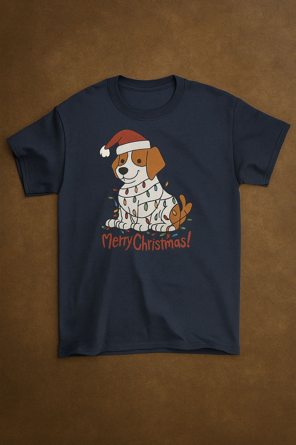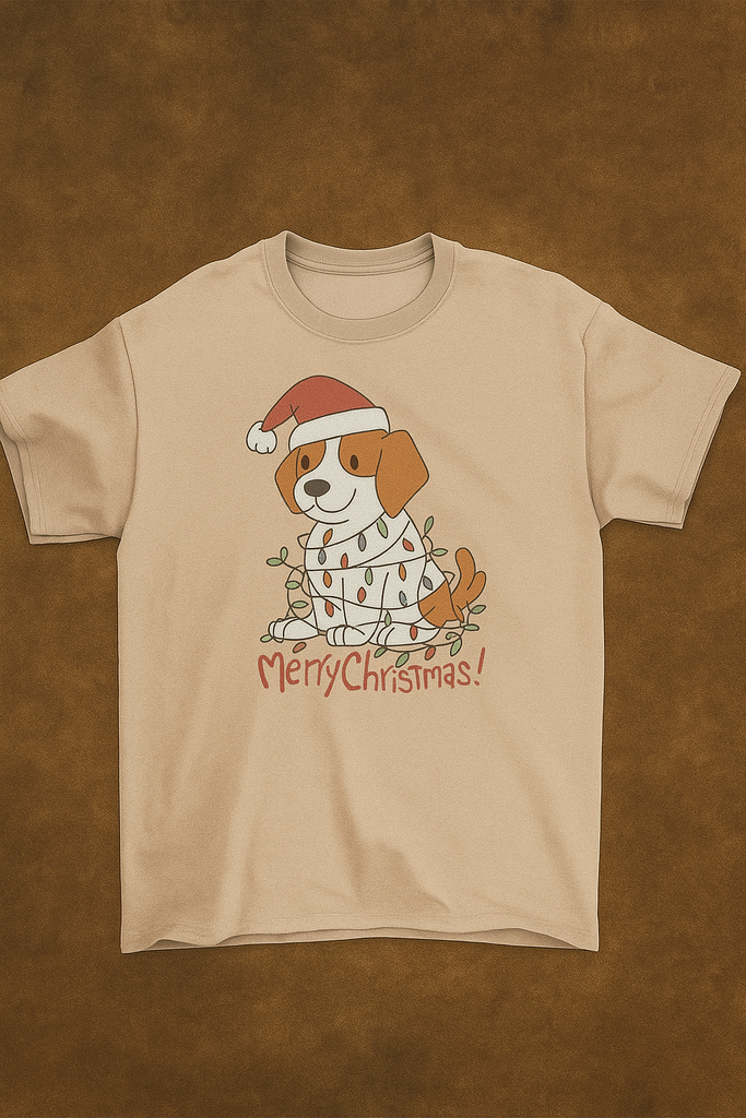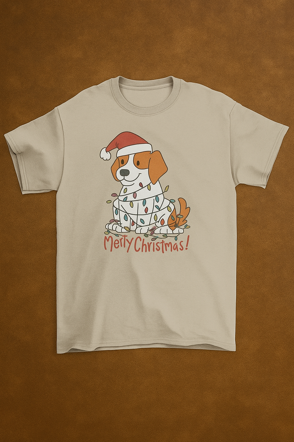 Featuring an adorable beagle wrapped in Christmas lights and the cheerful quote “Merry Christmas,” this shirt brings cozy vibes, a smile to your face, and joy to every dog lover’s heart.
